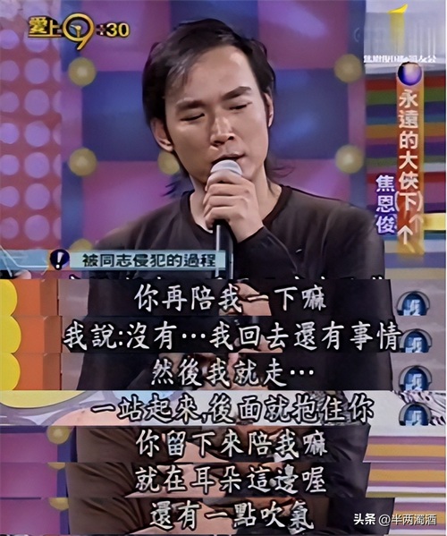 台湾演员焦恩俊更是遭遇导演的性骚扰。在准备拍戏时,焦恩俊被男导演叫到房间,聊天后想离开时,男导演一把从后面紧紧搂住他,还在他轻声靠到他耳边吹气说“你陪陪我”。吓得焦恩俊赶紧找借口逃离。
