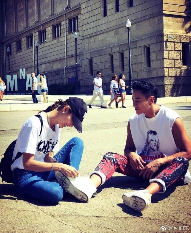 很多人都以为何润东变胖了,其实他是壮的,平日里经常健身,胡杏儿也透露说何润东是剧组里身材最好的。 今天他穿着白色T恤,但是露出了双臂,确实是十分壮硕。何润东与老婆席地而坐,老婆在他的鞋子上弄着什么,不知道的人还以为这是替何润东系鞋带呢。Peggy笑得很甜,两人看起来十分甜蜜。