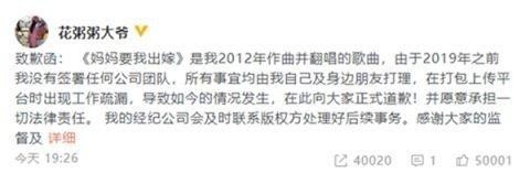 《妈妈要我出嫁》是我2012年作曲并翻唱的歌曲,由于2019年之前我没有签署任何公司团队,所有事宜均由我自己及身边朋友打理,在打包上传平台时出现工作疏漏,导致如今的情况发生,在此向大家正式道歉!并愿意承担一切法律责任。我的经纪公司会及时联系版权方处理好后续事务。感谢大家的监督及指正!