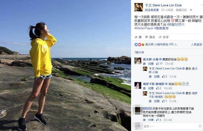 林千又先前曾因谈话主题相同,退吴宗宪的《小明星大跟班》通告,这两天她参加《综艺玩很大》录影,特别感谢主持人宪哥的照顾、指教,说:「每一次录影,都把它当成最后一次。谢谢玩很大,让我重新回来,我会从心出发」,透露期待再出发的心情,粉丝与好友也为她打气。