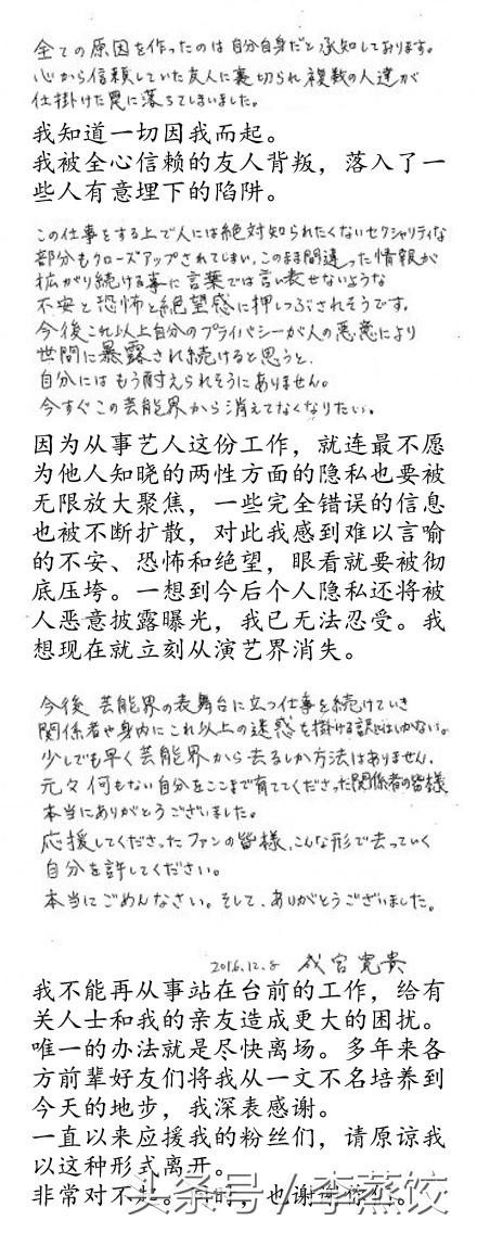 而成宫宽贵则发表公开信坦言自己受到信赖的朋友出卖并陷害,并表示:“我被难以言喻的不安、恐惧、绝望压到快崩溃”,于是决定尽早离开演艺圈。