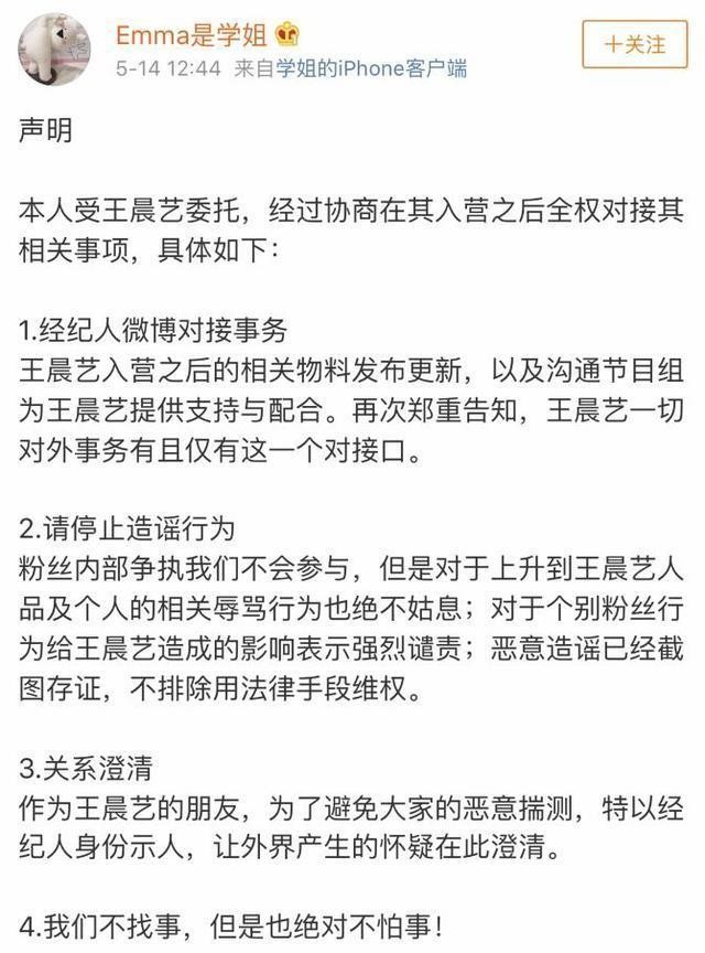 他的经纪人也有就此事专门声明回应过,王晨艺在参加节目前确实是个素人,但参赛后需要有经纪人从中协调一些工作,于是王晨艺就委托她来帮自己处理这些工作,她私下和王晨艺是很要好的朋友,二话没说就答应了,没想到现在倒成了攻击他的理由。