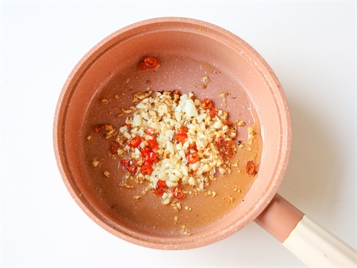3.锅中放入适量的食用油,放入蒜末、小米椒炒香,注意用小火,防止炒糊