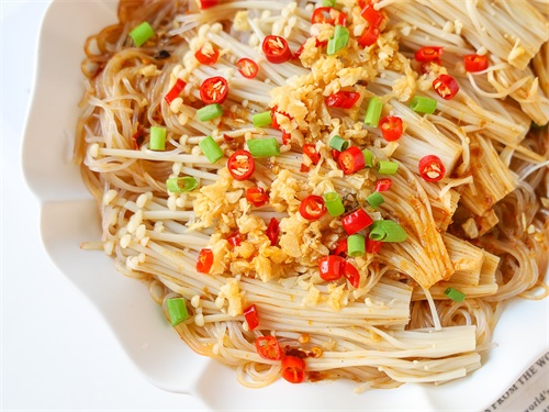 做这道蒜蓉金针菇时,喜欢吃粉丝的朋友还可以多加点粉丝。当热油被浇到金针菇上,蒜蓉的香味、小米椒的辣味、金针菇的鲜味全被激发出来,做起来真的又快又容易,一定好吃,不会失败。最重要的是咸鲜美味,带辣开胃,特别下饭。