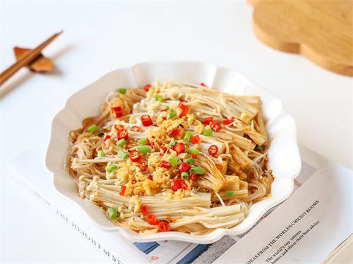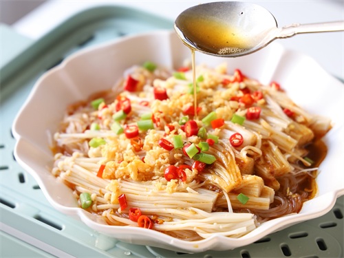 5.金针菇上锅蒸制时,不嫌麻烦的还可以包上保鲜膜后再上锅蒸,这样多余的水蒸气就不会进到盘里,金针菇的味道会更浓郁些。