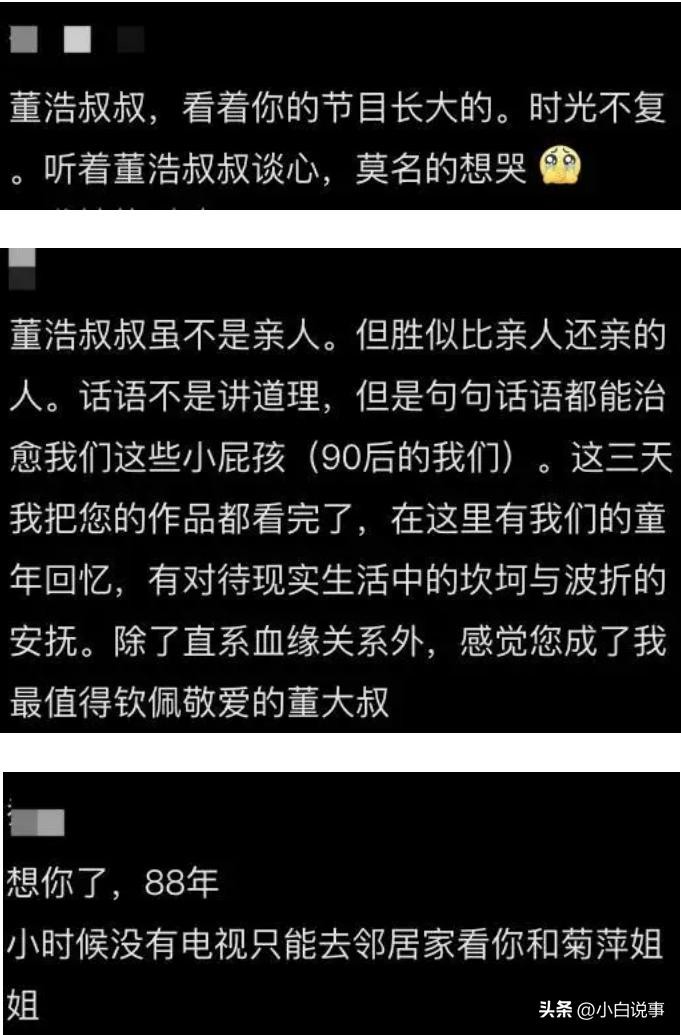 看完董浩叔叔的故事,不少网友都被深深触动。有人感慨:"真希望大风车的风能把我刮回童年";也有人说:"谢谢董浩叔叔、金龟子、鞠萍姐姐,谢谢你们给了我们最美好的童年回忆。"