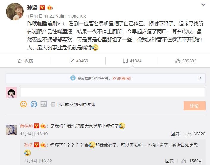 蔡徐坤的体重不仅刺激到了小编我,更是刺激到了孙坚,随后孙坚微博发文:“看了著名男明星晒了自己的体重后,吃了很多减肥产品。”蔡徐坤在评论里认领自己:“是我吗?我忘记跟大家说那个秤坏了。”