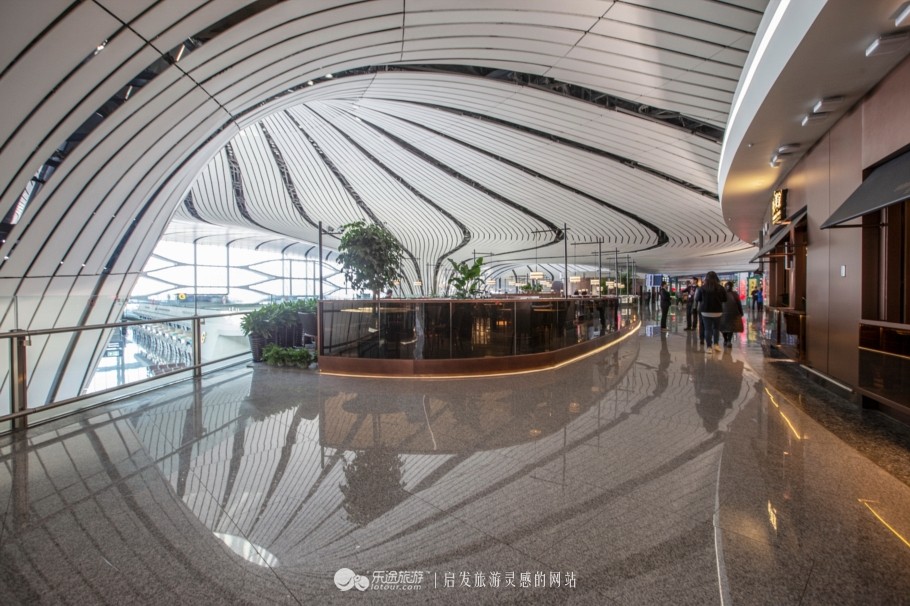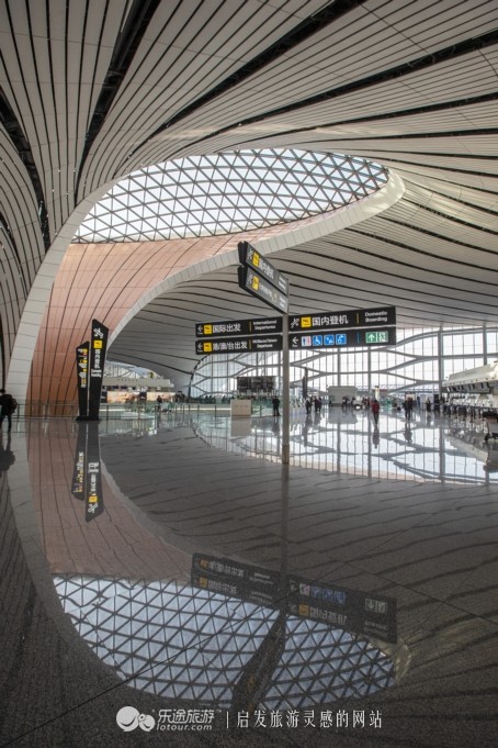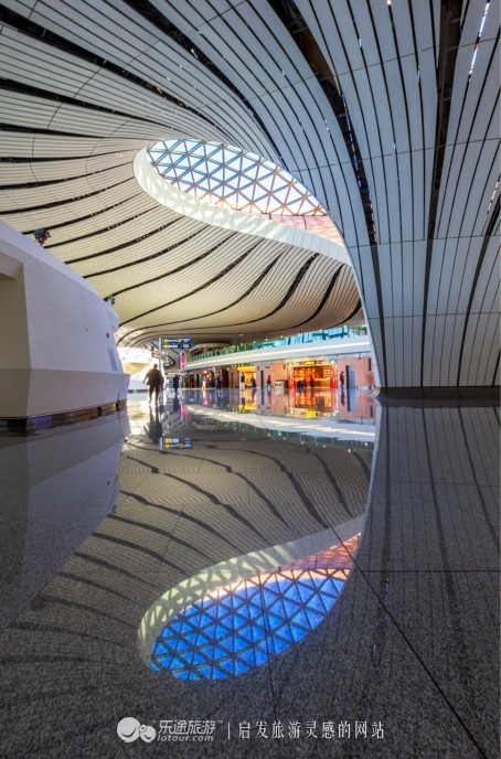机场大厅充满了现代艺术感!巨大的弧线卵叶形采光天窗和曲线天花浑然天成,在如镜地面的反射下,天地交融、相互辉映如梦似幻,让人分不清哪是墙壁、哪是地面。