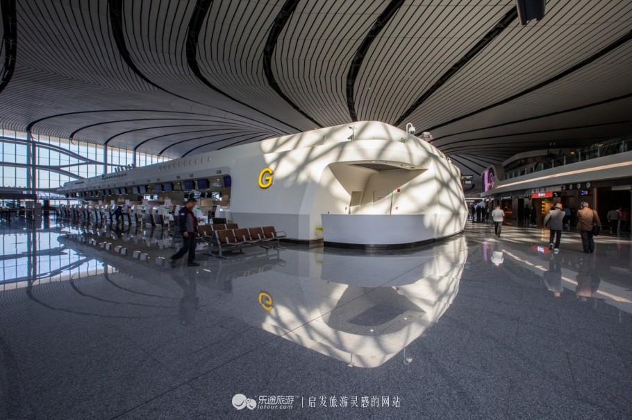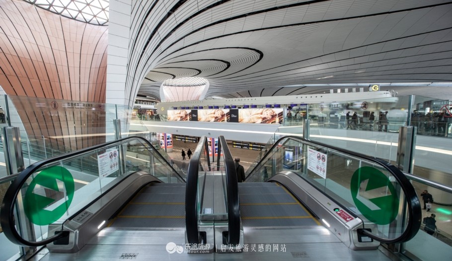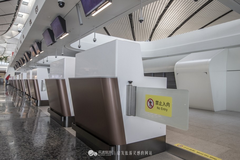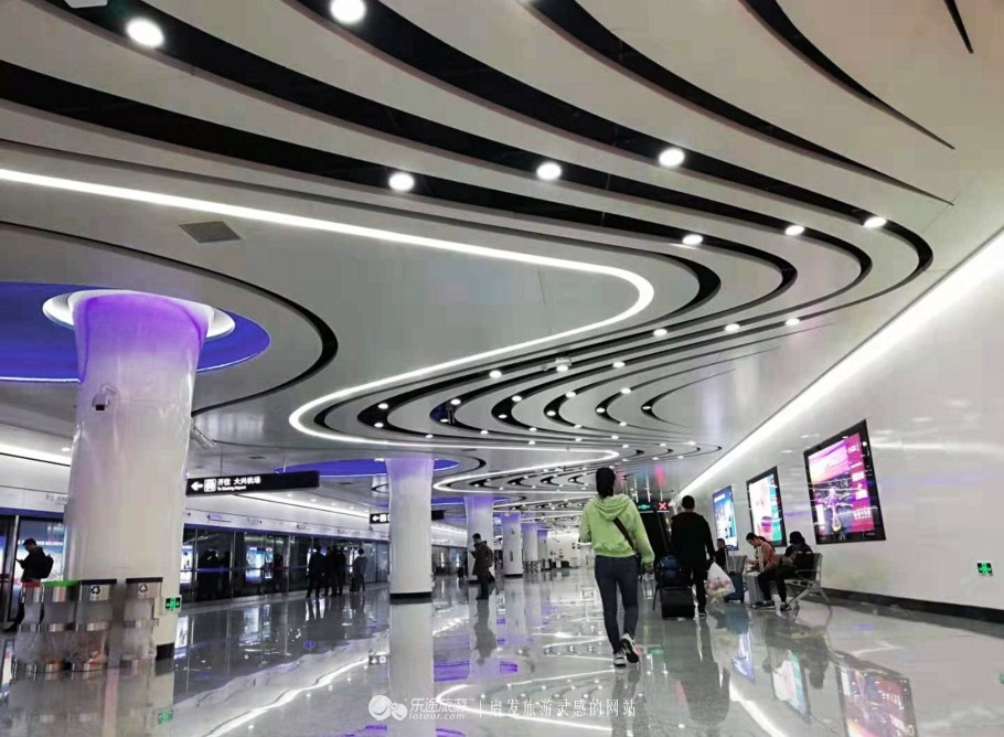 为了一睹这个世界体量最大、施工速度最快、最漂亮、最现代号称二十一世纪一大奇迹的骄傲工程,我专程前往一探究竟。从北京地铁10号线草桥地铁站、经连接通道很快便进入了换乘大厅。最为引人注目的便是天花板的曲线,在光亮如镜的地面衬托下,大厅更显得宽大无比、豪华靓丽。在这里可以直接办理乘机手续,大大方便了乘客。机场快轨车厢整洁舒适,全部是沙发座椅,在车门旁边就是造型美观、高低适中的行李架,取放行李毫不费力,设计非常人性化。