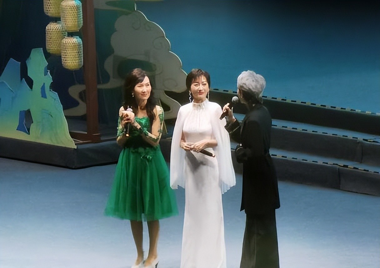 她身着绿衣蓬裙,矗立在众星云集的舞台上,与身旁的赵雅芝相比,更显得衰老。赵雅芝一袭白裙,55岁的容颜仿佛被封存在岁月之外,身形曼妙,神采奕奕,她的光彩仿佛穿越了时光,令人难以移目。