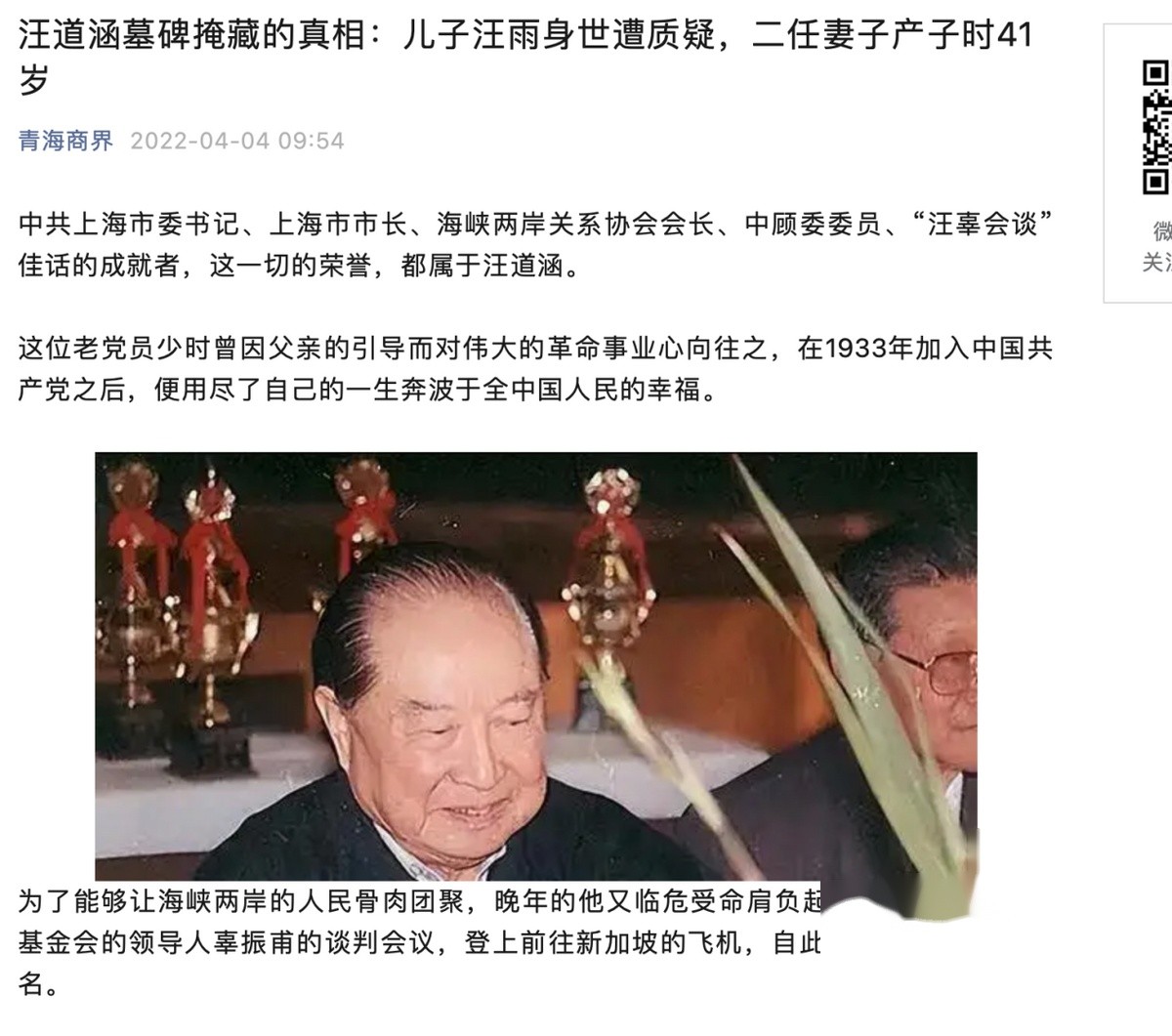 汪道涵墓碑掩藏的真相:儿子汪雨身世遭质疑,二任妻子产子时41岁