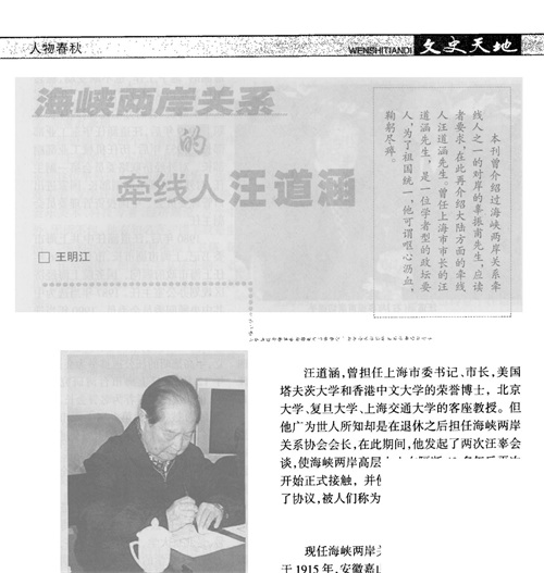 而在这样的历史背景下,汪道涵的智慧和胸怀展现出了重要的作用,他先后担任海峡两岸关系协会的领导职务,积极倡导和推动两岸交流与合作,为促成“汪辜会谈”做出了重要贡献。