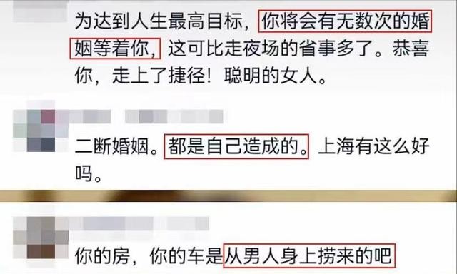 有人质疑她的房、车都是从男人身上捞来的,还恭喜她走上捷径,称日后将会有无数次的婚姻等着她。