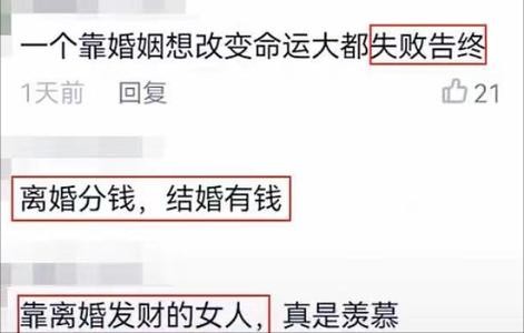 有人则似看好戏似的表示离婚都是她自己造成的,暗讽她每一个想靠婚姻改变命运的人大都以失败告终。