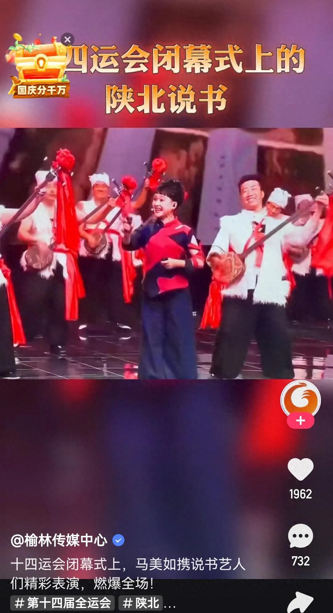 第十四届全运会闭幕式上“陕北说书”登台亮相了,一群书匠在舞台中央把三弦弹得震天响,一个叫“马美如”的网红从台中走来,亮着嗓子说唱了一段《超越》说书剧。