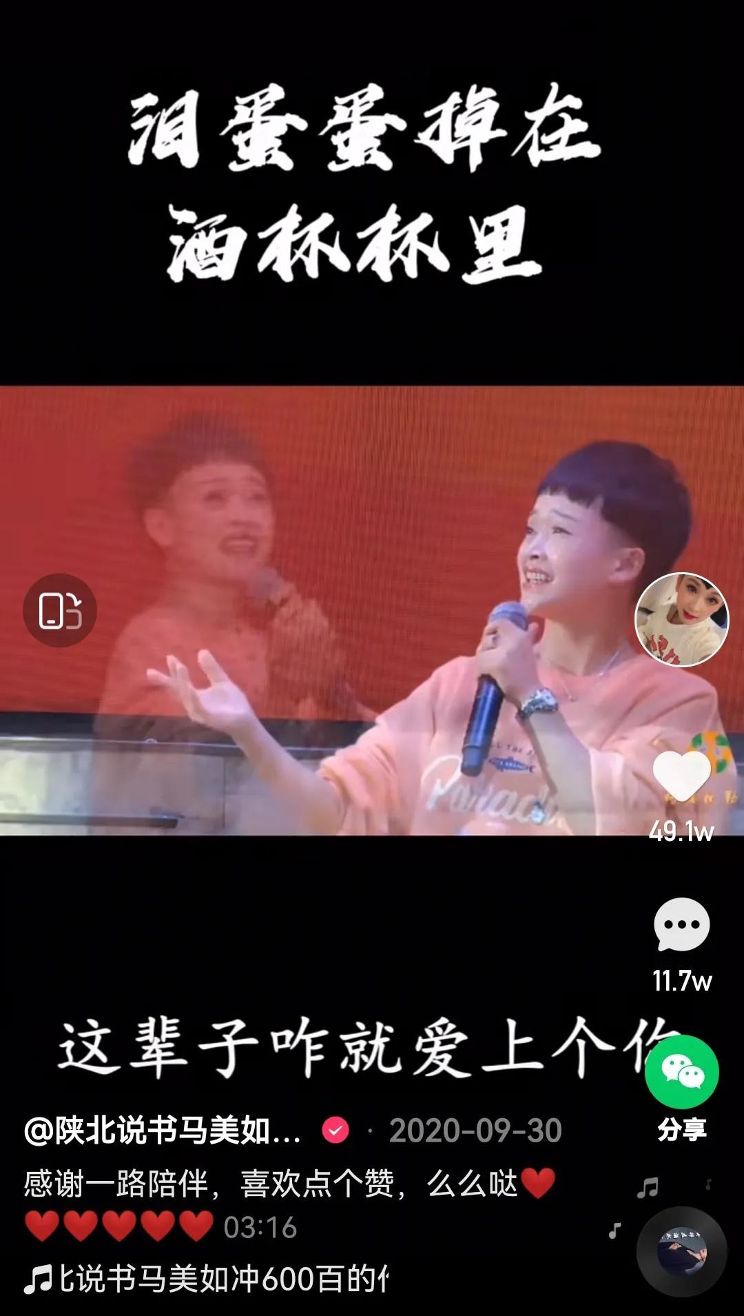 两年前我就开始关注马美如了,在众多的陕北网络主播里,她确实比较“另类”,比较俗,就是靠“卖丑”出洋相,唱歌加搞笑来吸引粉丝,说书其实很一般。而传统的陕北说书主要是以张竣功为代表的张派“梅花调”和以韩启祥为代表的韩派“靠山调”为主,相比韩派,张俊功的说书是一种创新,从说唱形式到乐器搭配都发生很大的变化,书词还是以古本为主,一本叫“相公戏姑娘”一本叫奸臣害忠良。传统说书主要是劳动人民茶余饭后的娱乐,以讲故事、逗笑、教育为主。如今张派代表人物高小青、张和平、罗 平、贺爱莲等也活跃在快手直播平台上,但是粉丝量远远低于马美如,一个重要的原因就是他们没有互联网思维、不懂平台经济和粉丝经济,不能与时俱进、不会开拓创新,被淘汰是迟早的事。而马美如的特点就是“创新”,能跟上时代的步伐,现在是网络时代,网络就是大海,大浪淘沙,最后留下来的一定是时代和粉丝需要的,马美如这次成功登上了全运会的舞台就是很好的例子。当然能不能走得更远,会不会掉下来取决于他们团队的思路和发展战略。