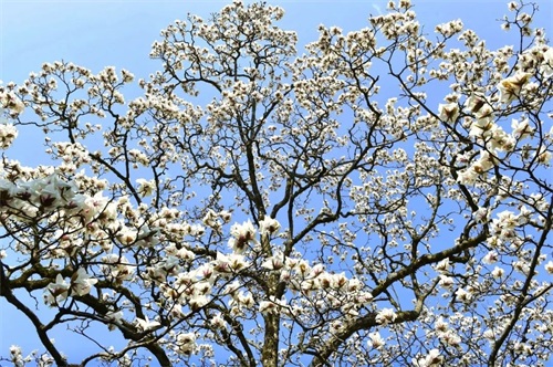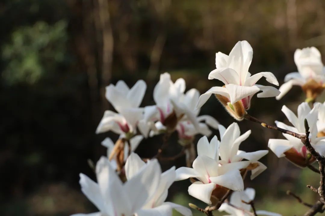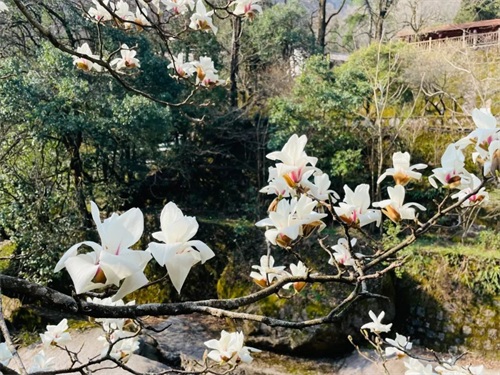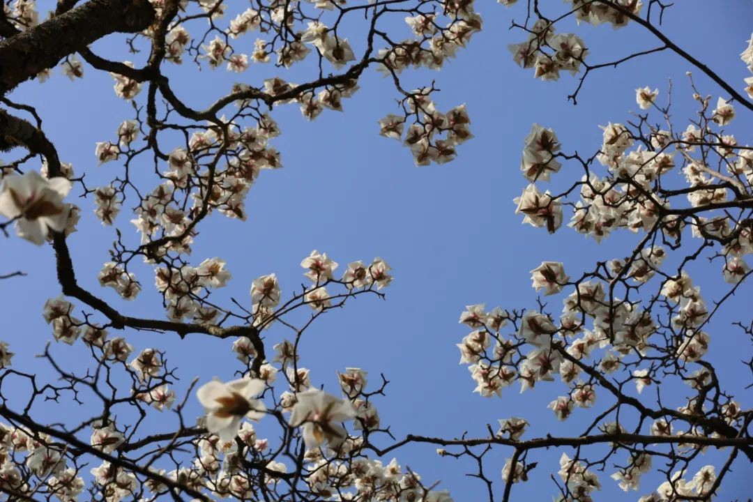 春风和煦,漫步黄山温泉名泉桥,一棵高大的望春花树傲然矗立,苍劲的树枝向高空延伸,一朵朵白中带粉的花朵次第渐开,有的立在树梢成盛放之姿,有的微微展开有含羞之态。