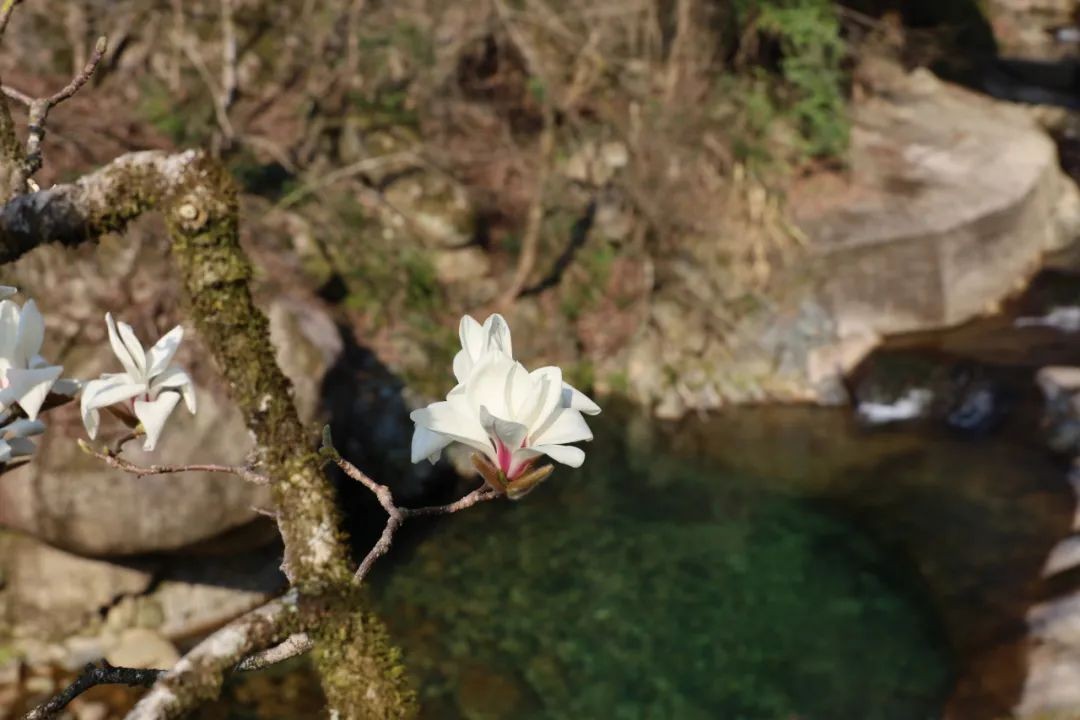阳光下,那些花朵也像在闪闪发光。蓝天青山、小桥流水,一树望春花点缀了春天的黄山。