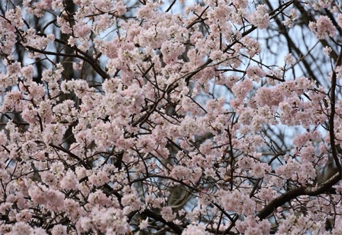 除了望春花,紫薇、樱花也不甘落后。在道路两旁、山间树丛,紫薇用紫红色的花高调展示着它的艳丽。而樱花就显得淡定从容不少,远远的乍一看是一团粉色的云,走近些粉粉的花朵簇拥在一起,与蓝天相互映衬,甚是好看。