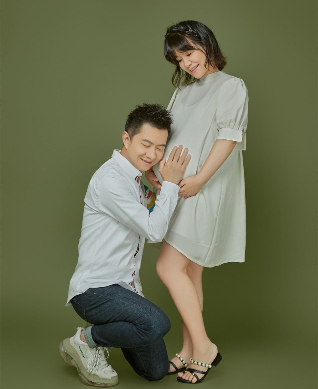 尽管红果果穿的裙子非常宽松,但也能看出肚子明显隆起,又圆又大,她必须用双手一起托住。绿泡泡跪在地上,侧脸贴在妻子的孕肚上,认真听里面有没有动静。