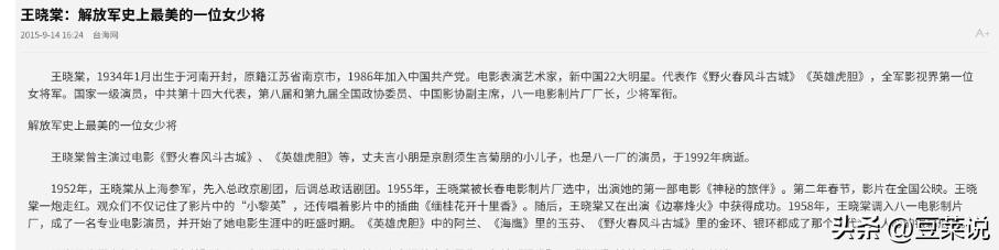 参考资料:台海网——王晓棠:解放军史上最美的一位女少将