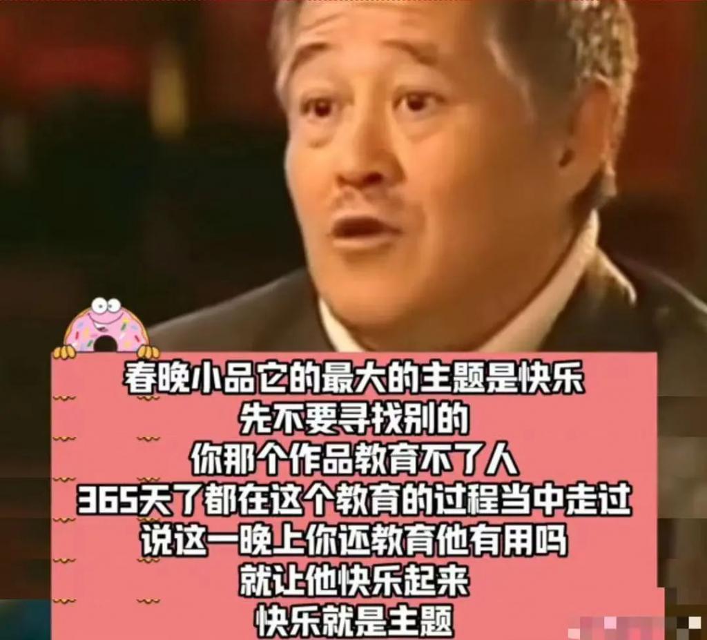 每年春晚,赵本山的一段访谈内容都会被翻出来再传播:" 春晚小品最大的主题是快乐,你那个作品教育不了人,365 天都在教育的过程中走过了,就这一晚上你还教育他有用吗?"