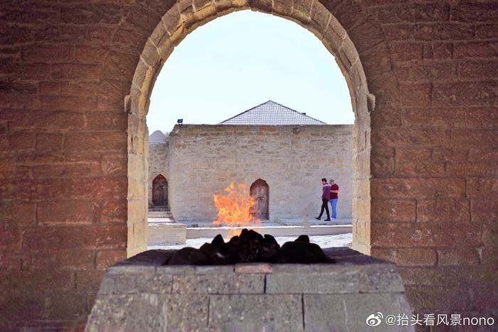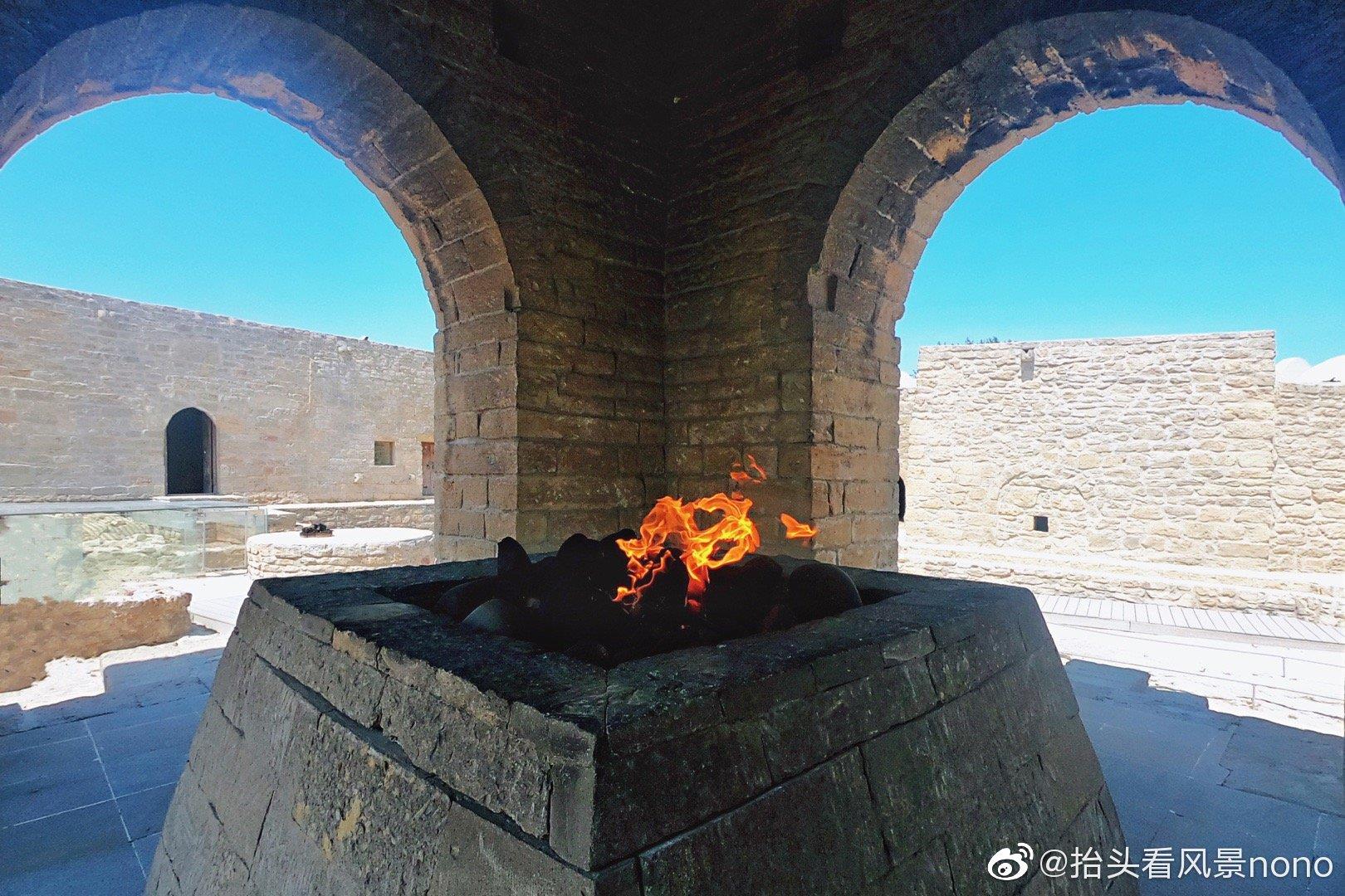还记得《倚天屠龙记》里的圣火令吗?源自当时波斯的“拜火 教”,阿塞拜疆也曾是波斯帝国的一部分。阿塞拜疆是地球上为数不多依然保留火祭和古老拜火教元素的地方。在这里,石油流出地面,天然气喷出烈焰火炬,都令世界各地的火焰崇拜者着迷。在阿塞拜疆首都巴库,有这样一座“拜火寺”(Atashgah Temple),因处于天然气田上,所以曾有相当长的一段时间里,这里出现大地自燃的现象。如今这里日夜不熄的火焰已经是从别处地下引来的天然气了。尽管如此,这里仍体现着阿塞拜疆人对火的崇拜。如果想看真正从未熄灭火焰,就在巴库东北25公里处的雅纳尔达格火山,这里是名副其实的火焰山,山下是一片因天然气不断燃烧的大地(图5),也是到阿塞拜疆不可错过的地方。