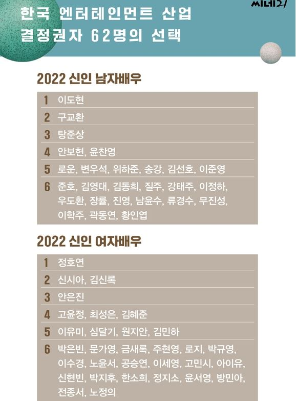 根据韩国电影杂志《cine21》的调查结果来看,2022年年度最受瞩目的新人男演员包含了《鱿鱼游戏》中饰演卧底警察的魏嘏儁、《梨泰院CLASS》中一举成名的安普贤、《无法抗拒的他》的宋江、《D.P:逃兵追缉令》中饰演逃兵一角的李濬荣以及刚拿下KBS演技大赏新人奖的SF9路云,都相当受到瞩目。然而近期相当火红的人气男星2PM的李俊昊、金宣虎也都纷纷在入围名单,但排名上却没有挤进上位圈,反倒是出道五年以《Sweet Home》爆红的李到晛拿下第一,可以说是相当备受瞩目的新人黑马。