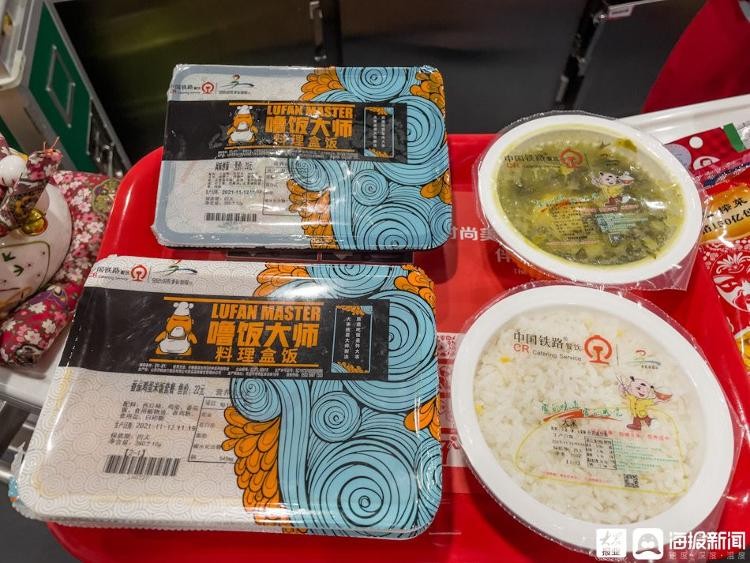 图:列车上提供专门为该动车组推出的适合沿线旅客口味的餐食,据工作人员介绍,该套餐食较其他列车上的餐食更加经济实惠。
