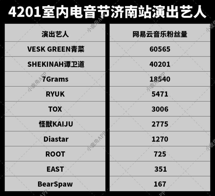 对于电音活动来说,演出阵容的头部选择其实也不多,这包括了2025年DJMAG CHINA评选的年度制作人第二名Terry Zhong这样的电音音乐人。其他DJ阵容也多为在网易云平台上有着几千甚至几百粉丝的电音音乐人,他们的身份还包括了厂牌主理人以及派对策划人等。显然,这样的阵容对于普通观众来说不具有吸引力。