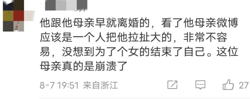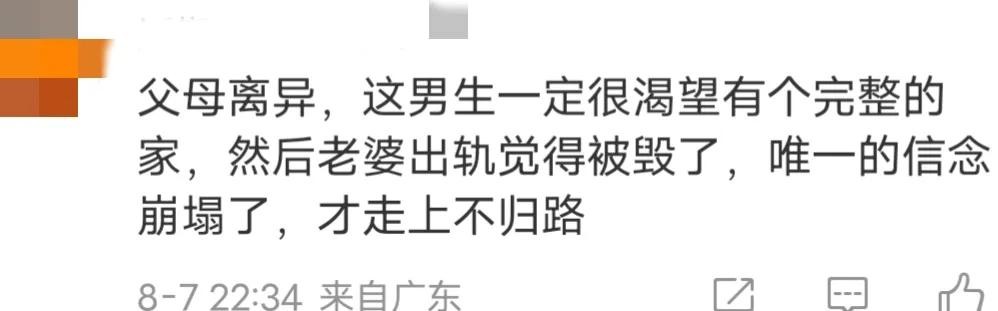 有网友说:父母离异,这男生一定很渴望有个完整的家,然后老婆出轨觉得被毁了,唯一的信念崩塌了,才走上不归路。