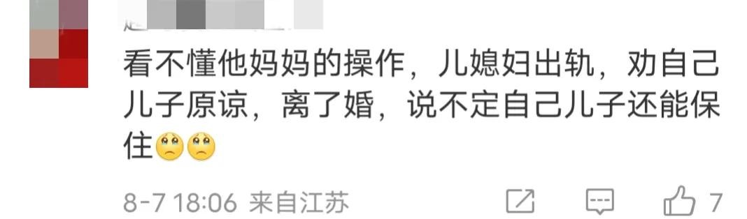 也有网友说:看不懂他妈妈的操作,儿媳妇出轨,劝自己儿子原谅,离了婚,说不定自己儿子还能保住。