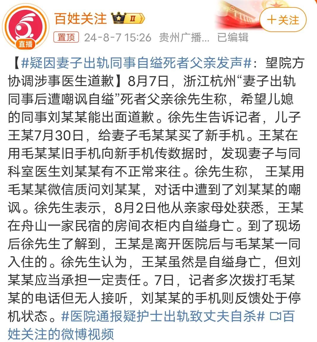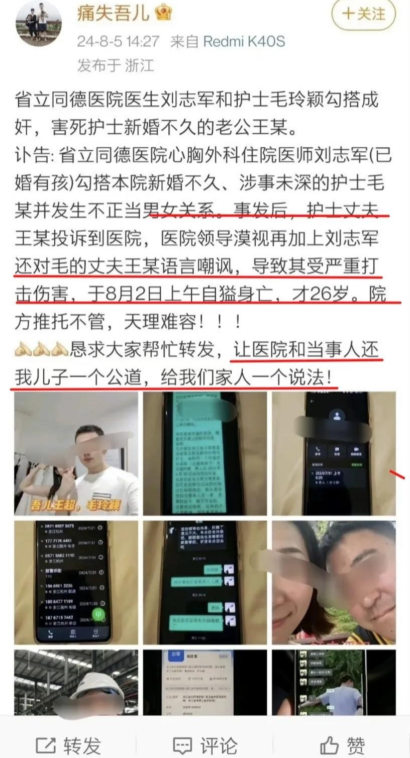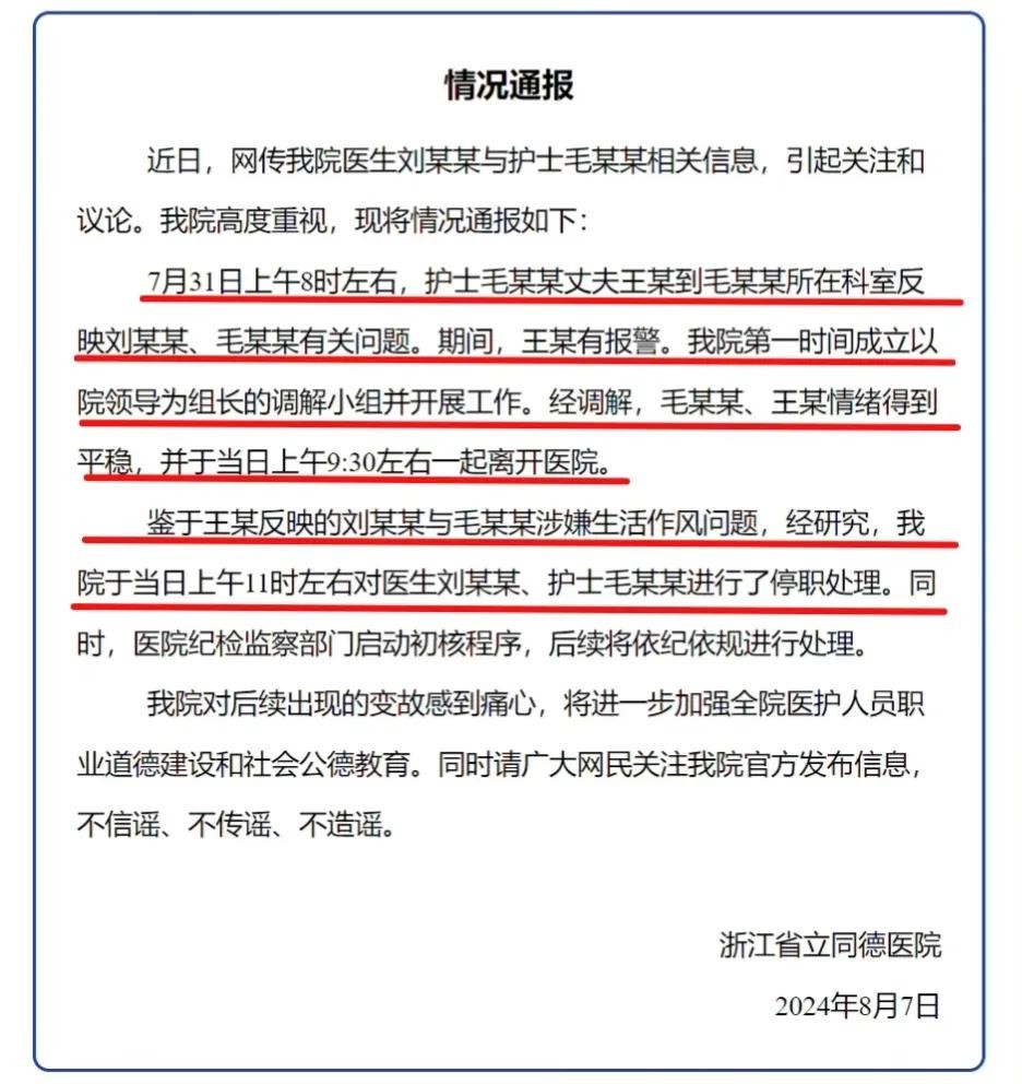 8月7日,浙江省立同德医院翠苑总院通报:涉事护士和医生因生活作风问题已被停职。纪检监察部门介入,对后续变故感到痛心。同日,有记者多次拨打毛某某的电话但无人接听,刘某某的手机则反馈处于停机状态。