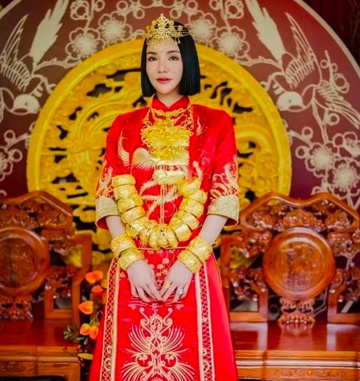 何猷君前女友新加坡名媛林慧俐大婚的时候,头上脖子上手臂上挂满了金器。