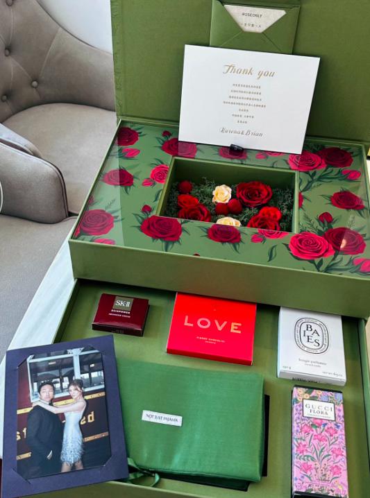 ps. 吴千语的伴手礼里面有 SK-II 大红瓶面霜,GUCCI 香水,ROSEONLY 永生玫瑰等等,总价值大概在 6000 左右,这些应该都是品牌赞助的,吴千语还特地录了一个伴手礼视频,发在社交平台上。