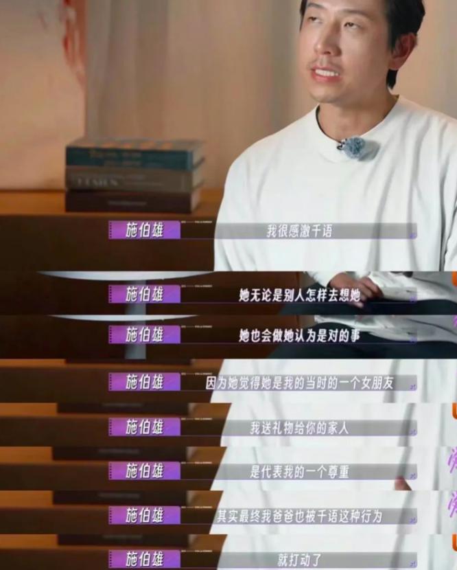 施伯雄说后来吴千语通过给施家人买礼物,以及让施家人看到施伯雄跟她在一起后性格上的改变,而慢慢打动了施家人。
