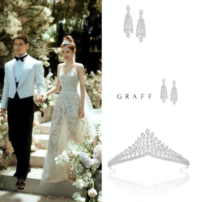 她头上的这顶钻石冠冕,来自 Graff Tribal 系列,钻石总重 31.74 克拉,搭配同系列 11.15 克拉钻石耳环,一身行头几百万。