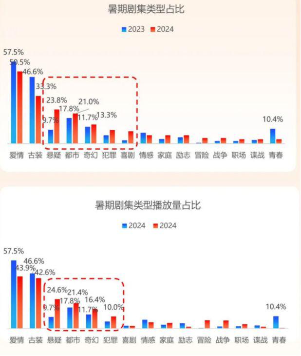 灯塔专业版的《2024 暑期档剧集观察》显示,题材类型表现中,爱情、古装在数量、播放量占比上双双下降,而位列第二梯队的悬疑、都市类型均有明显上涨,其中悬疑题材涨幅超过一倍。虽说暑期档还是古偶甜宠大本营,但眼见垄断地位在被打破。
