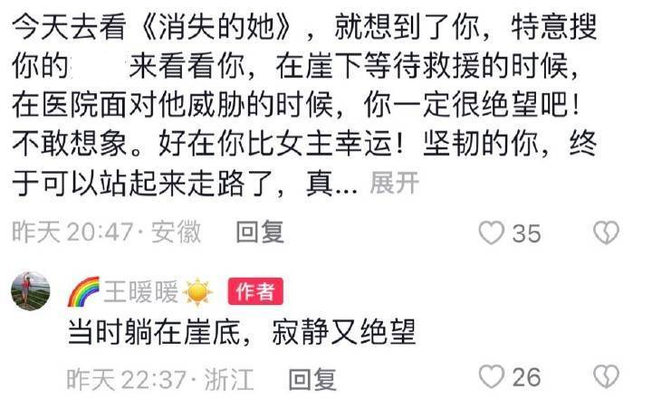 在看完影片《消失的她》之后,一些网友表示这个故事似曾相识,很容易联想起当年的泰国坠崖孕妇案,就在当年,此事引起舆论热议,丈夫因金钱谋杀妻子的恶行更令大众感到气愤。为此,网友前往案件当事人的社交平台进行求证,没想到,当事人王暖暖大方回应此事,同时分享了她当时的情绪状态。