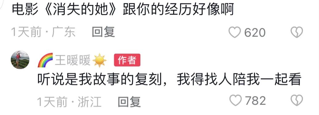 王暖暖在评论区确认了影片原型的说法,透露影片创作团队三年前就向她拿过授权,并且表示她会找友人一同观影,言语之间似乎担心影片中相似的情节会引发她情绪上的波澜。面对大家观影之后的问候,王暖暖坦然分享了当时的心理状态——寂静又绝望。更令人惊心肉跳的是,她与杀人魔前夫斗智斗勇的全过程。