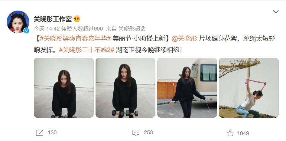 9 月 14 日,关晓彤工作室在社交平台上发布了一组关晓彤在剧组片场中的健身动态。通过图片可以看出关晓彤在片场休息时十分自律,或是提着哑铃或是跳绳或是深蹲进行健身运动,她的一双大长腿非常抢镜,可以看出身材保持得非常好。