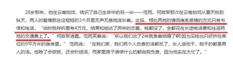 一开始,生活并不宽裕。何政军尚未成名,范雨的薪水也很一般。他们一家三口住在仅9平米的小房间里,伶仃贫寒却其乐融融。范雨把全部心思都放在了支持丈夫的事业上。而何政军也为了让妻儿过上好日子,拼尽全力在演艺事业上勤奋拼搏。