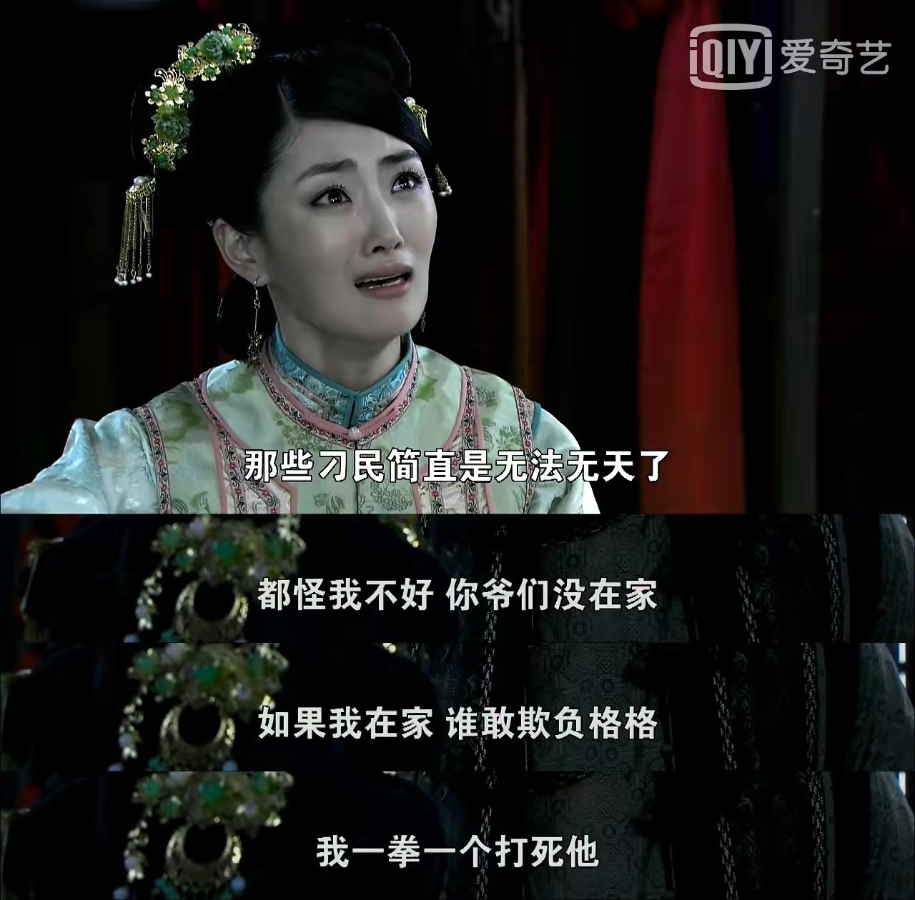 那家因为贩卖鸦片被逮捕的时候,玉格格伤心欲绝,生怕那图鲁没了以后,孩子就没爹了。玉格格还因戴天理被处决的时候在外面看了会热闹,被民众吐槽、辱骂,还被泼粪水,回来以后就躲在房间伤心地哭泣。那图鲁知道以后,对玉格格说:格格不哭,都怪你爷们不在家,如果你爷们在家,还有人敢欺负你,我一定一拳一个打死他。