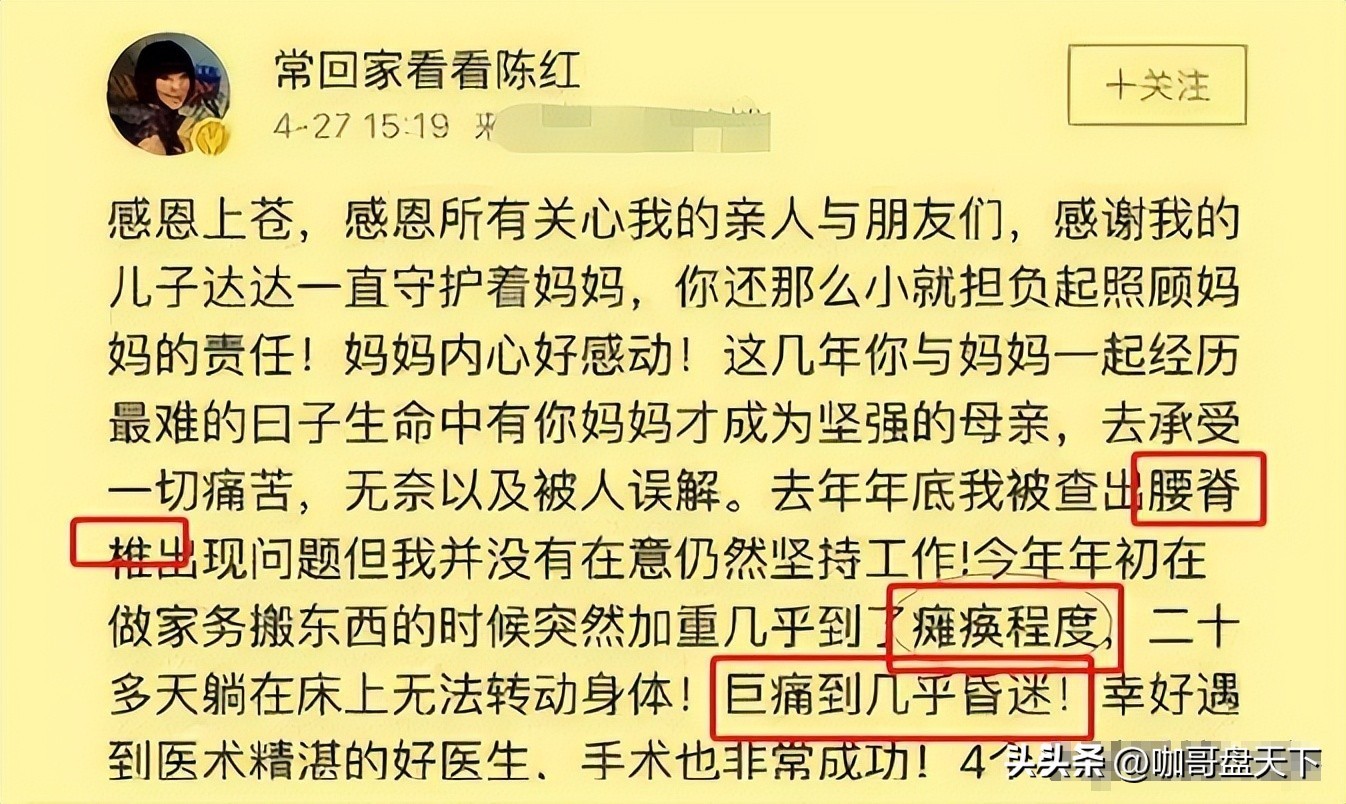 陈红因为病情被及时发现,又有医生的高超治疗,才得以躲过一劫。她感激医生的治疗和儿子的陪伴,出院后特别发文表示了感谢。