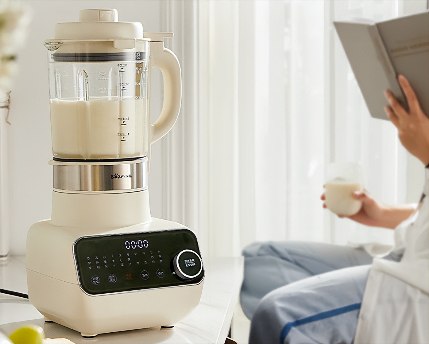 此款破壁机来自小熊电器品牌,外观采用米白色奶呼呼设计,放置在厨房既时尚又温馨,符合年轻人口味。