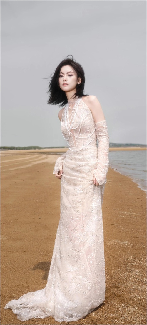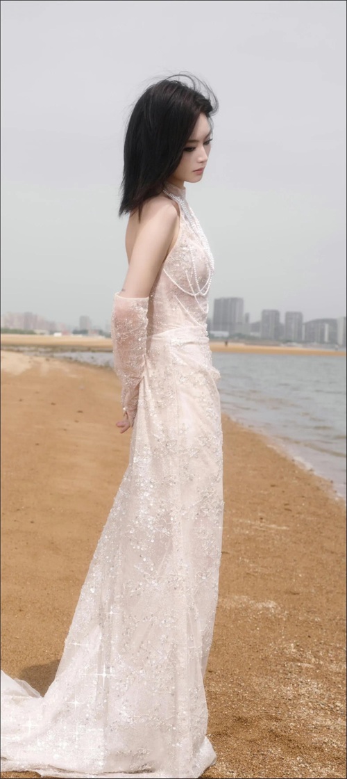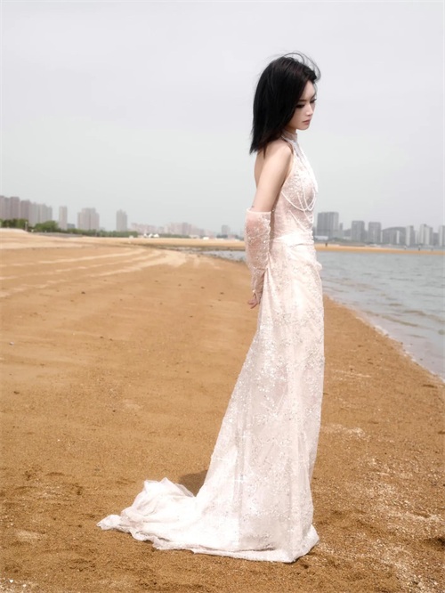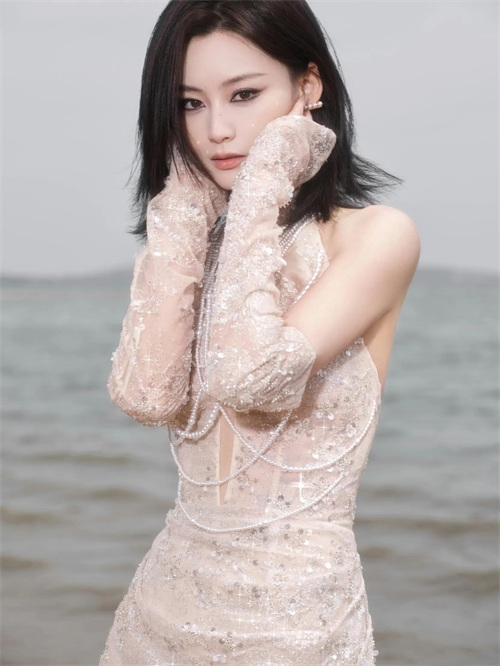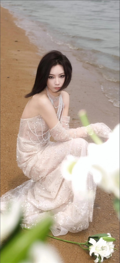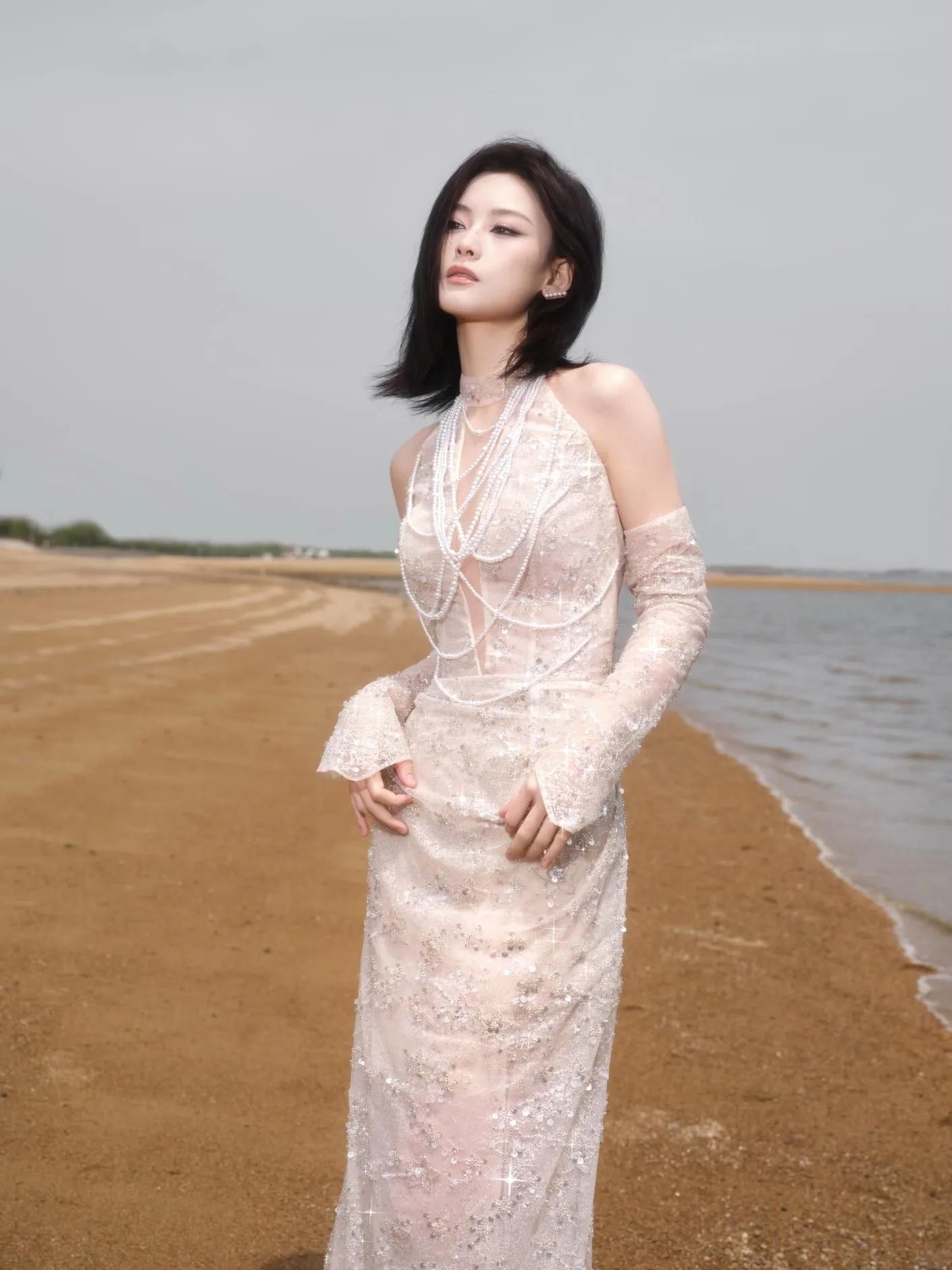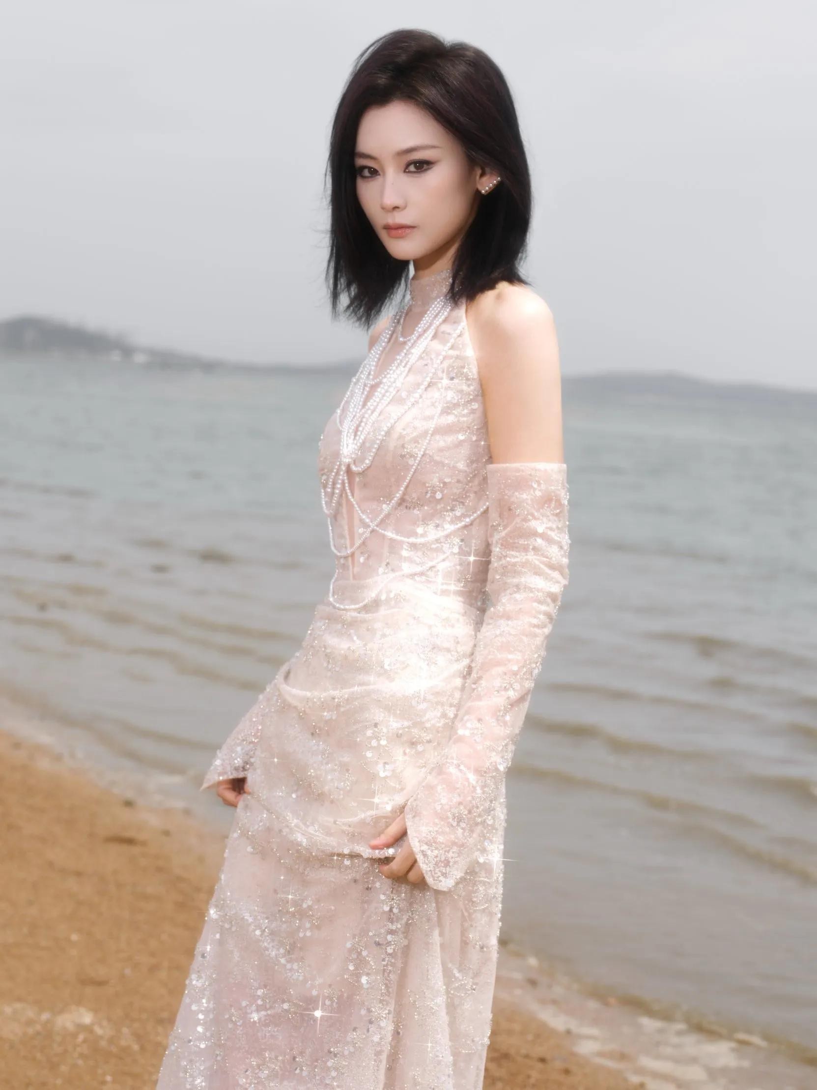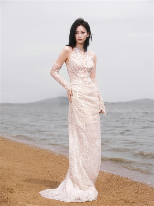 女明星高清壁纸-尚语贤 尚语贤海边珍珠亮片长裙高清无水印壁纸