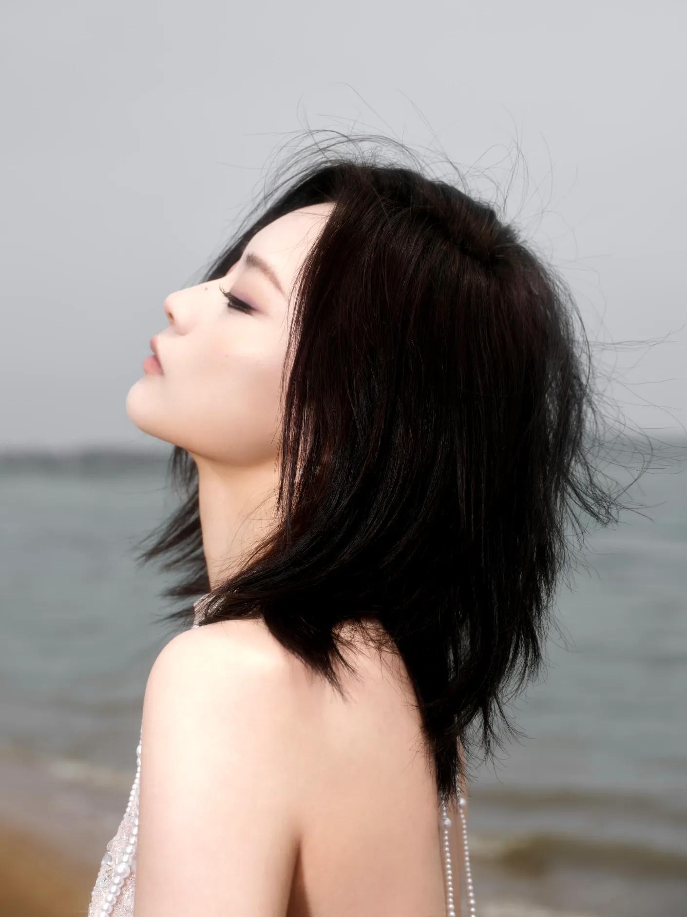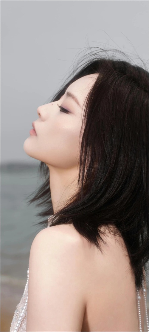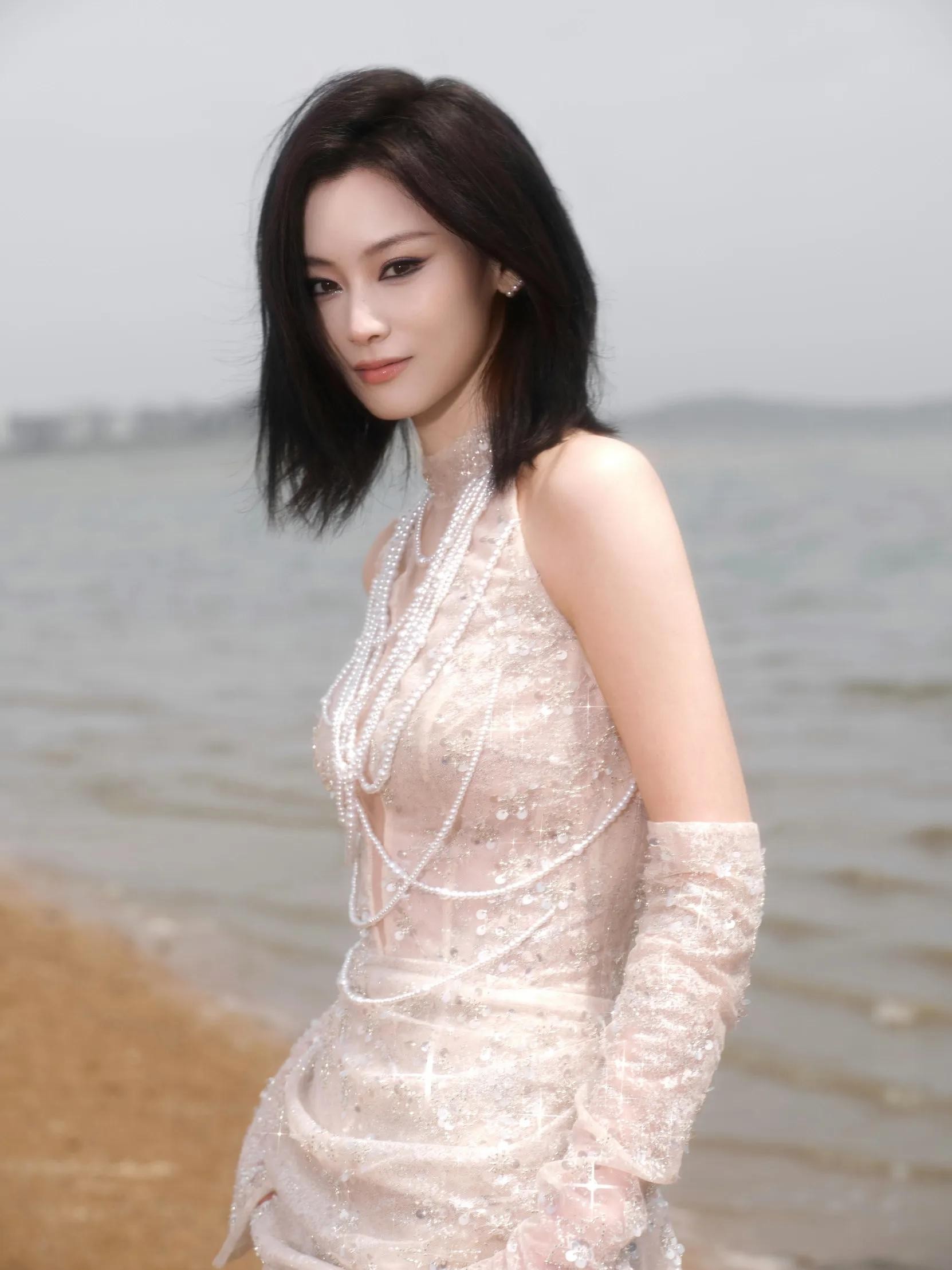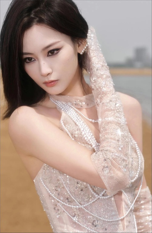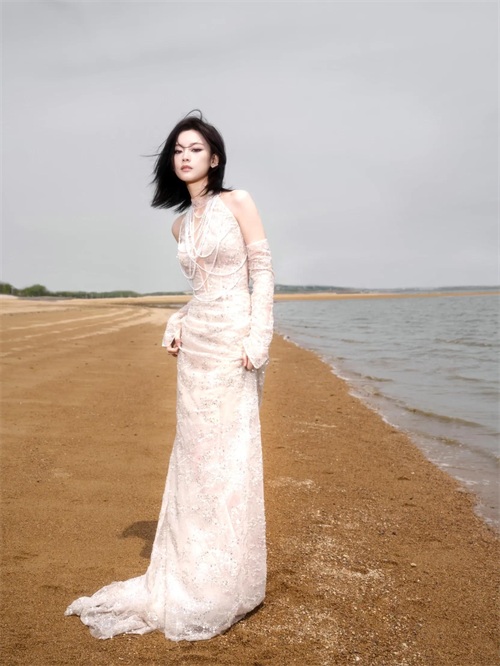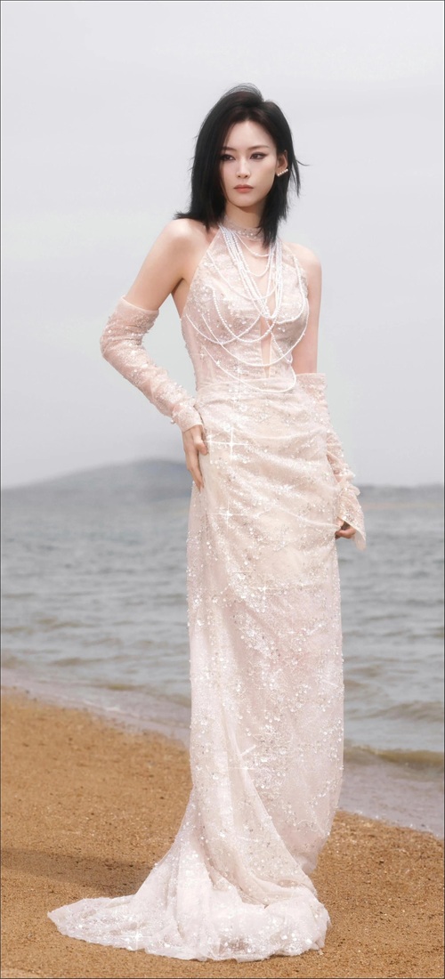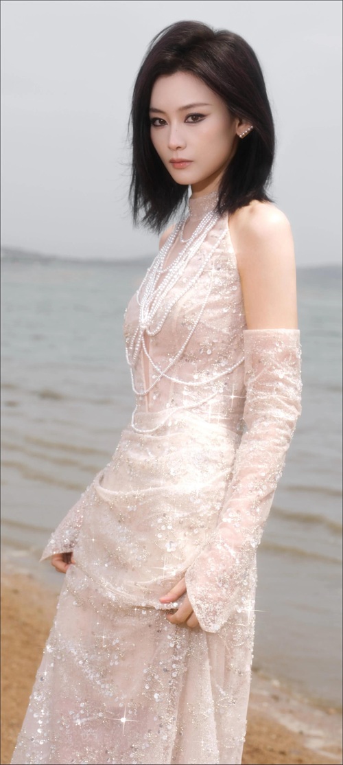 女明星高清壁纸-尚语贤 尚语贤海边珍珠亮片长裙高清无水印壁纸