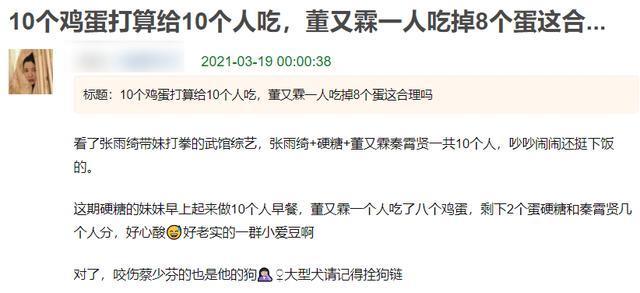 在《姐姐妹妹的武馆》这档节目里面,口碑和形象最差的嘉宾大概就只有董又霖了。而让观众对他意见最大的一件事,莫过于“八个鸡蛋风波”。事情的起因就在于希林娜依·高在做早餐,然后董又霖就让希林娜依·高帮忙煎蛋,然后希林娜依·高就问董又霖要几个,董又霖就表示要八个。