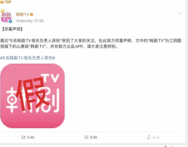 随后,为避免误会,正版“韩剧TV”官方微博发布声明,强调被告的是江阴酷视公司旗下的山寨版“韩剧TV”。