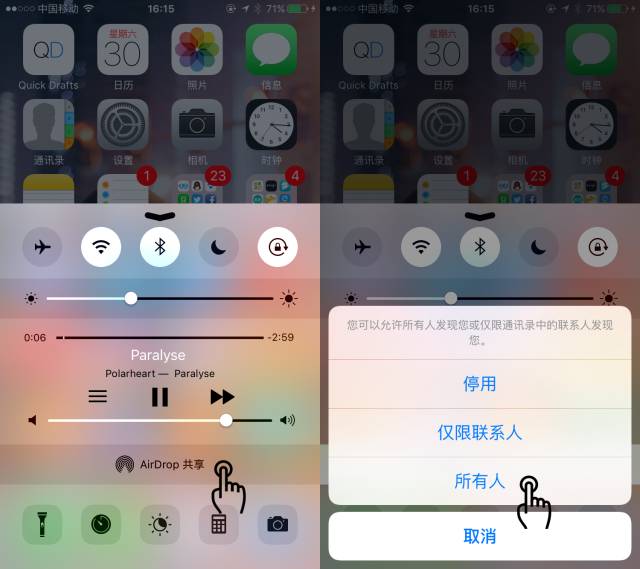 第二步: AirDrop 里设置“任何人可见”。 (接收文件的时候)▼